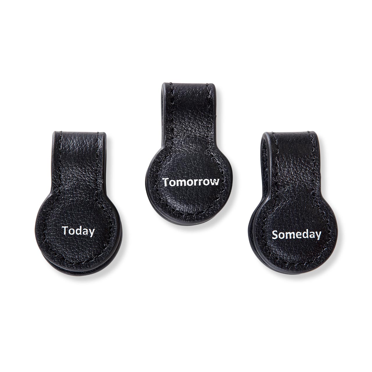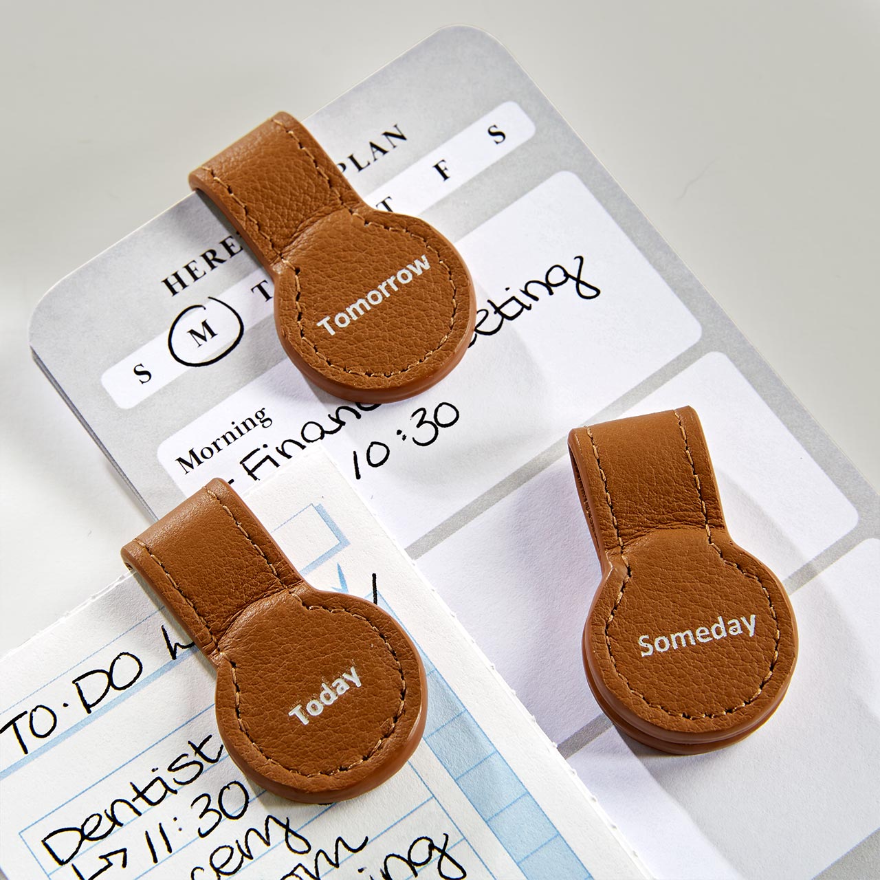 Sort through your paperwork more efficiently by using these handy leather binder clips to group and prioritize tasks. What will you accomplish Today? What can wait till Tomorrow? Don’t know when you’ll get to it? Well, you will, Someday. Each strong magnetic clip holds up to 30 standard sheets of paper. Ideal to use with a set of note cards.