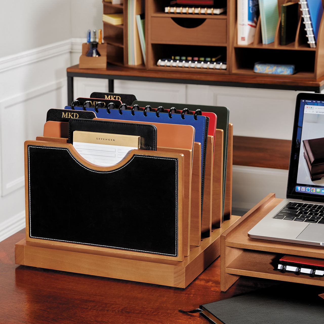 Our versatile leather desk organizer. With the removable dividers of our Adjust-A-File desk organizer, you can give each folder as much (or as little) space as it needs. Give yourself up to 10 slots to organize and divide work, or remove dividers for larger binders and folders.